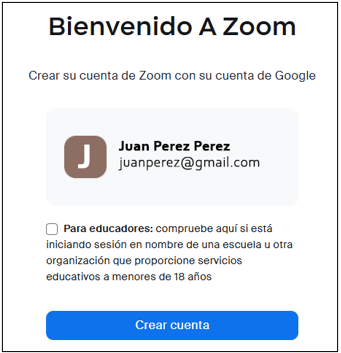 6. Si es la primera vez que inicia sesión en Zoom con su correo Gmail se le mostrará el siguiente recuadro por única vez. Clic en crear cuenta