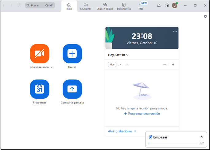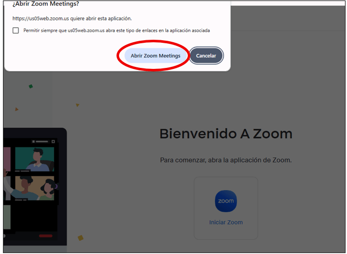 7. Se mostrará el siguiente recuadro de bienvenida. Clic en Abrir zoom meetings o en iniciar zoom.