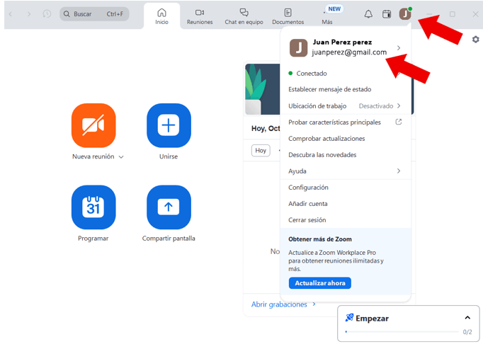 9. Compruebe que su correo Gmail de matrícula figura en su perfil de zoom.